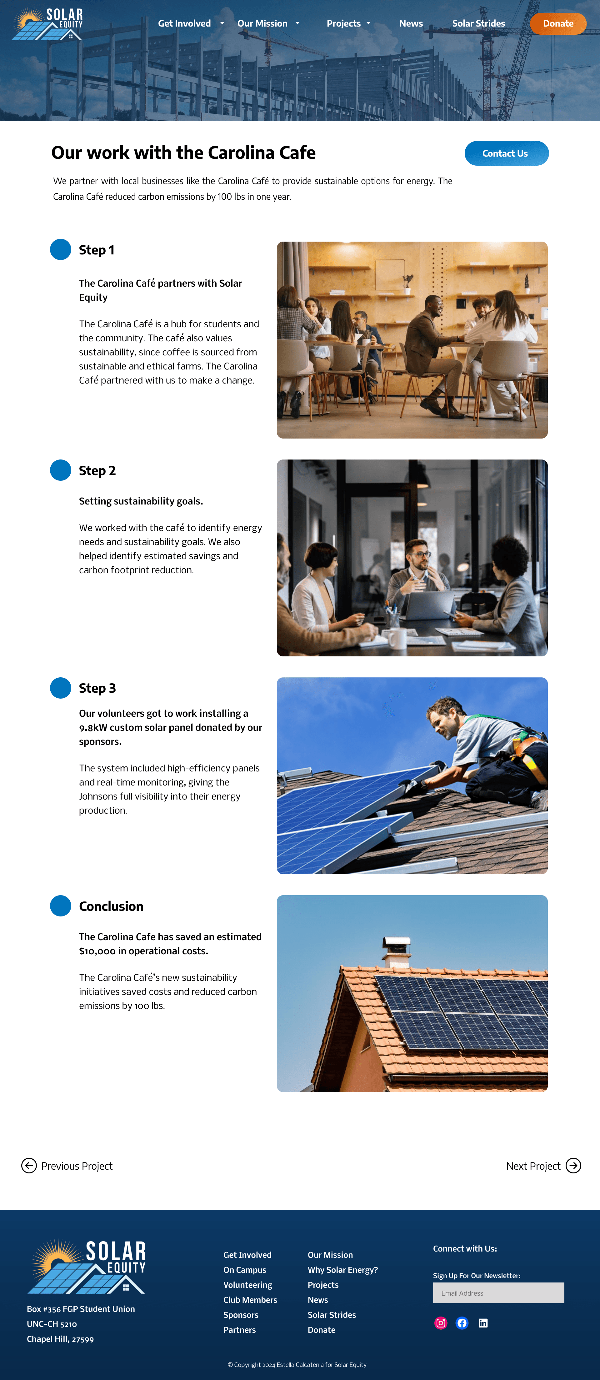 Project pages: Portfolio-type pages walking visitors through Solar Equity's previous projects.